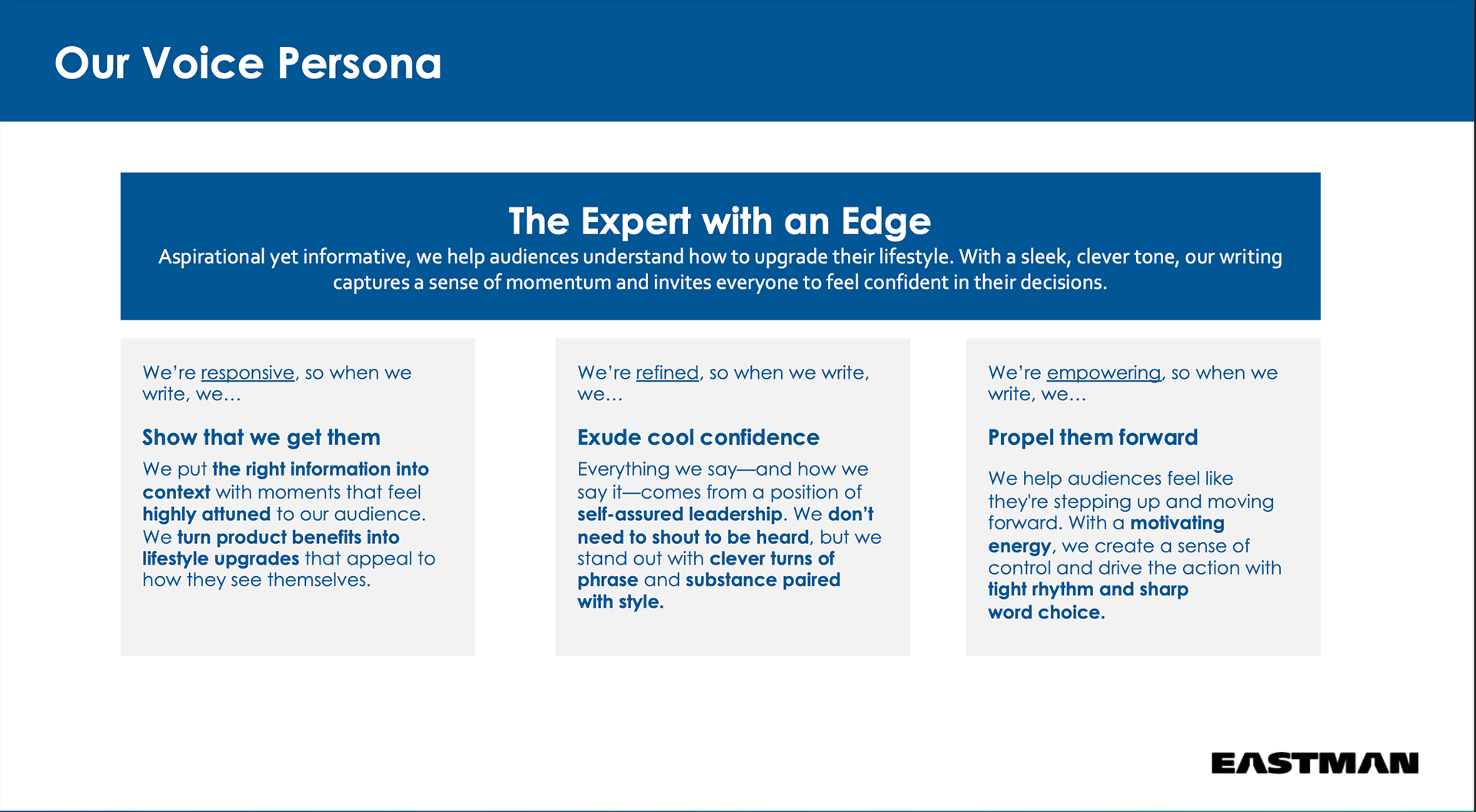 Once their themes were set, we stocked up on sample copy lines that filtered the "Expert with an Edge" persona through each messaging pillar.