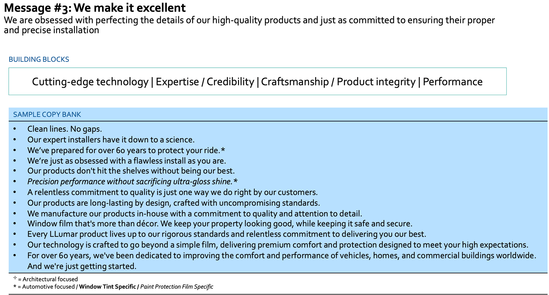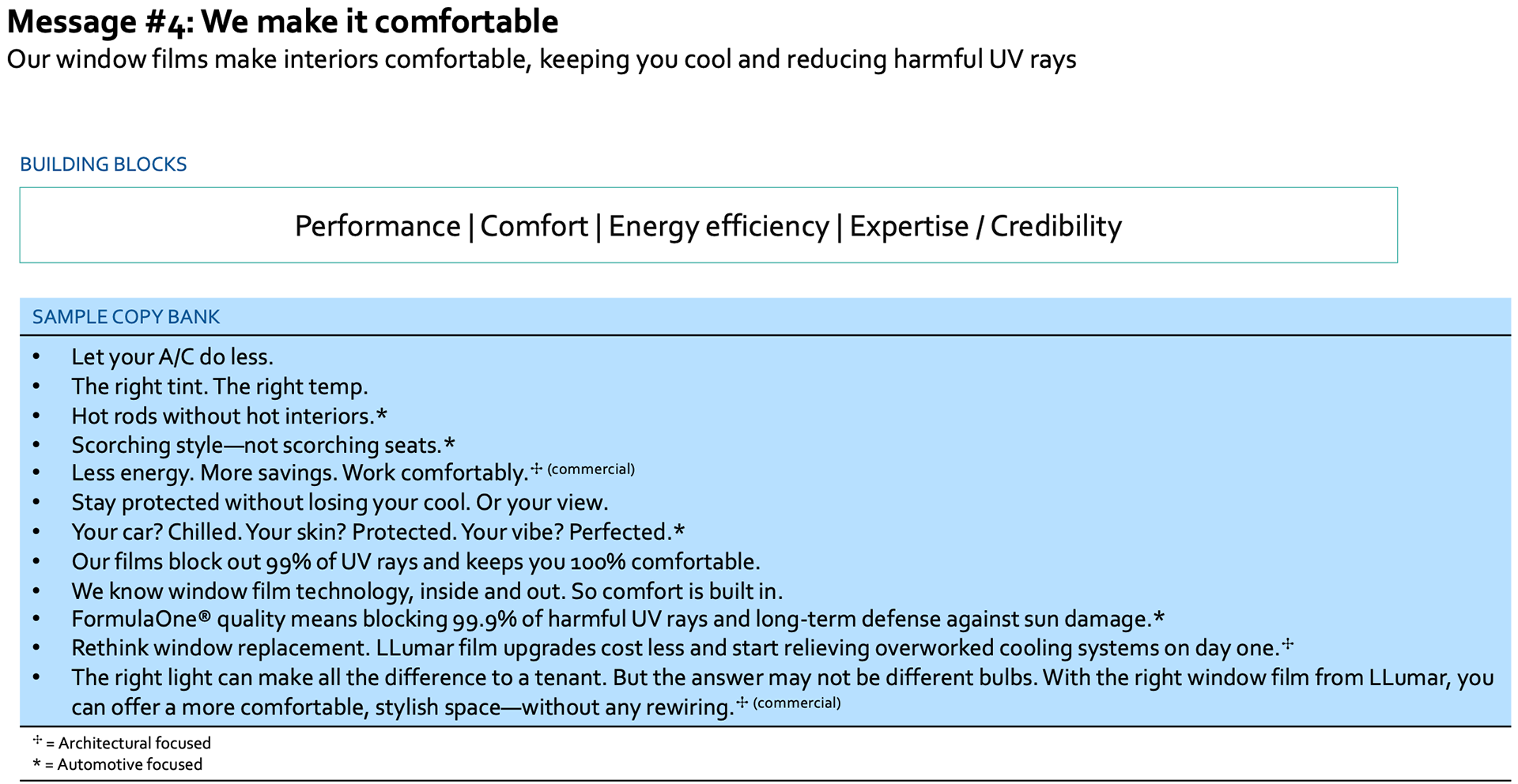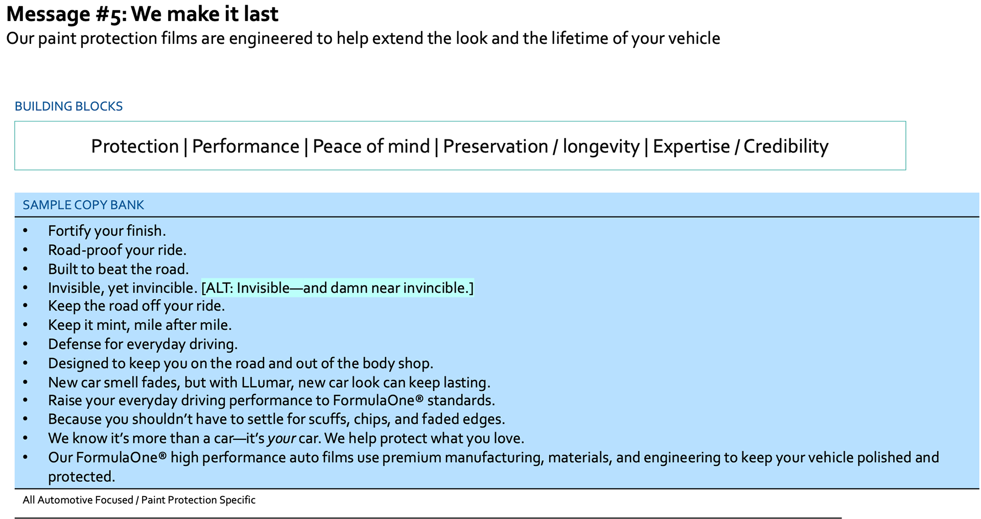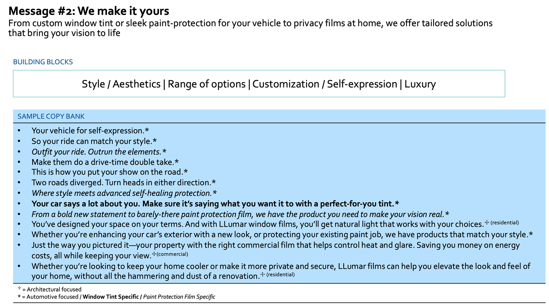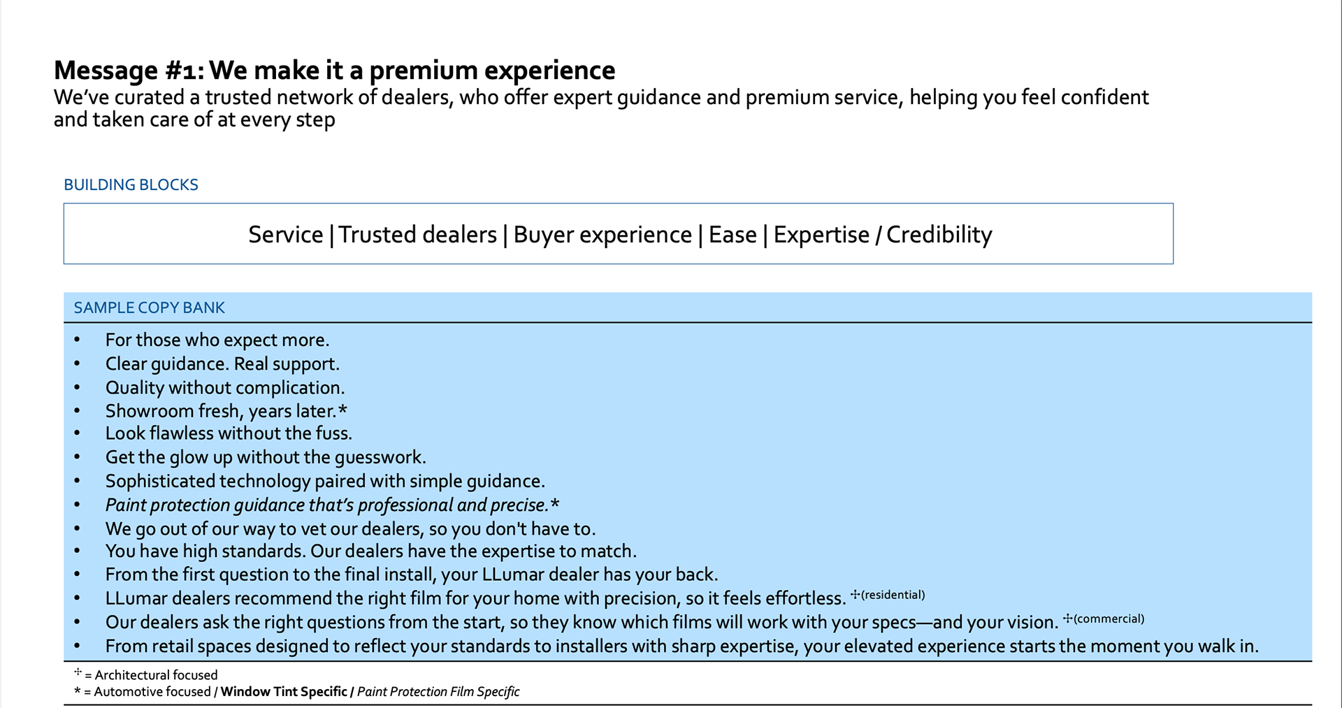 Inspired by the winking, elevated voices of high-end editorial writing, I helped write a new set of tone of voice guidelines for Llumar based on "The Expert with an Edge" persona. Through sharp wit and insider language, we raised their trust with dealers and high net-worth car owners through persona development, messaging strategy, do's & don't's, sample copy lines and blocks in action, and competitive research.