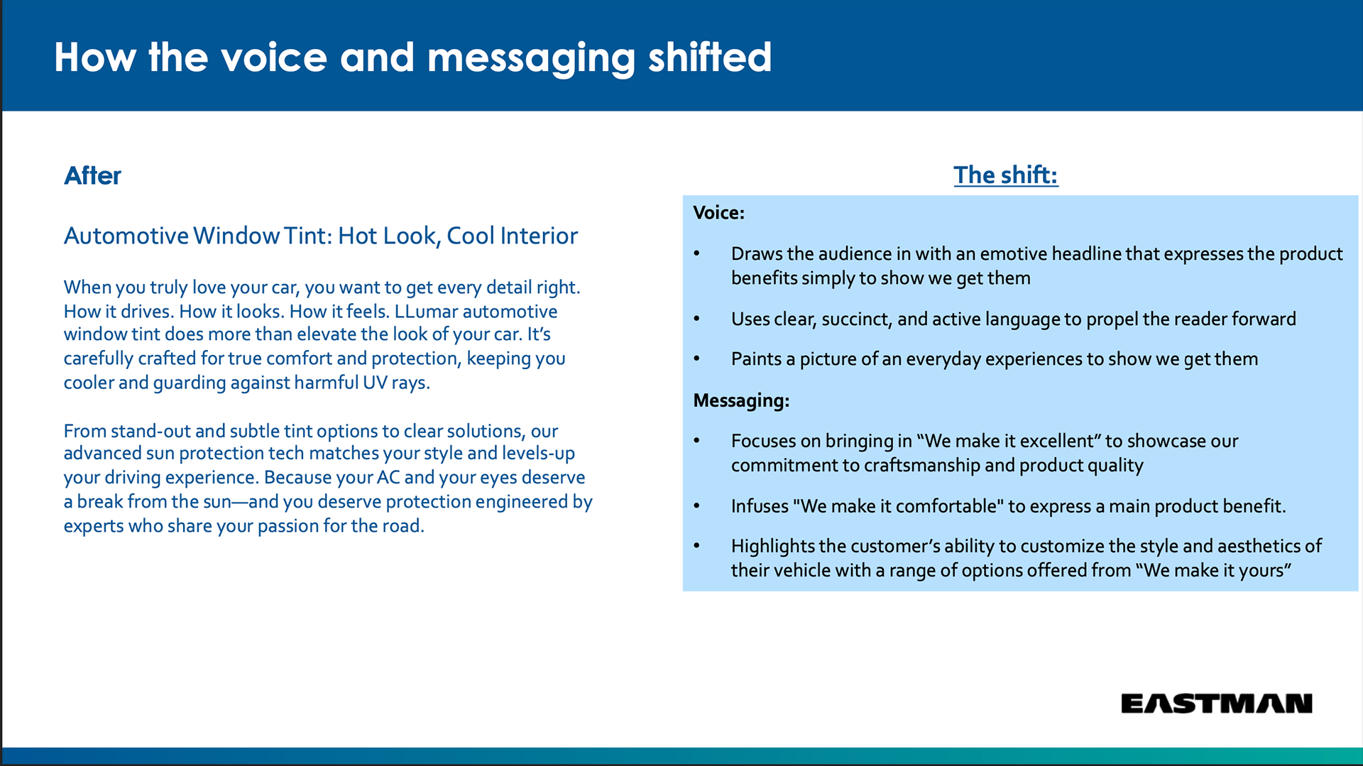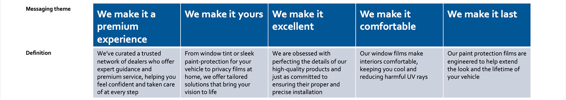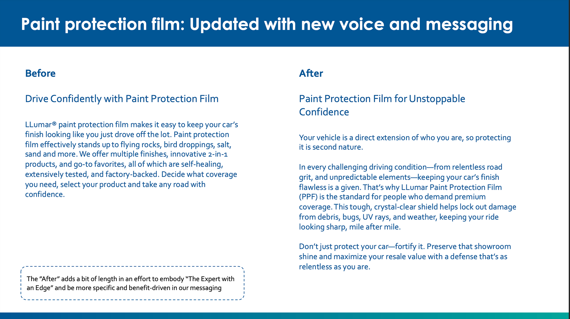 Performance films are all about style, protection, and trust, but outside of diehard auto gearheads, Llumar lacked personality and confidence in their tone of voice for anyone to know they lead the category. Meanwhile, the competition sped up into sixth gear with edgy personality, even if those brands missed the mark on product and installation quality.
